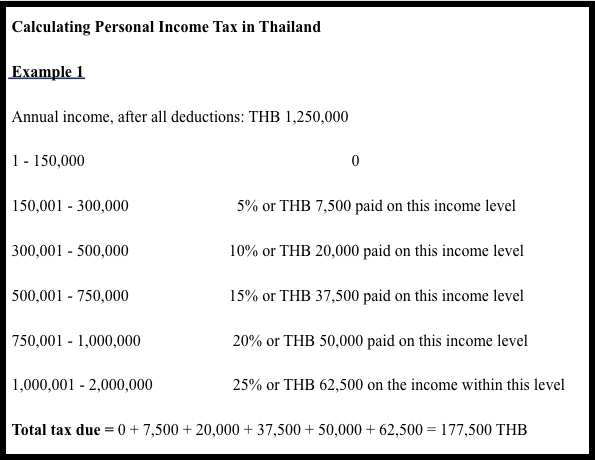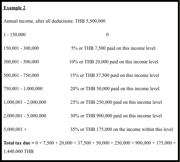 Thai personal income tax is based on eight (8) income brackets. Income is taxed at a flat rate within each bracket and added to the flat rate applying to the lower brackets (see examples).